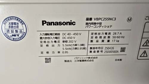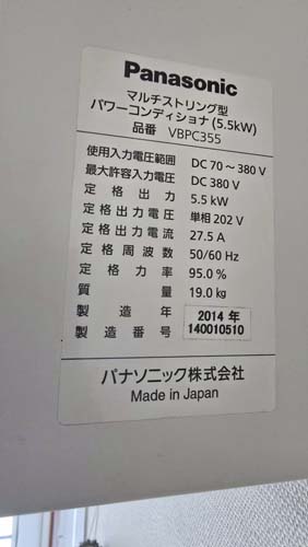 紀の川市貴志川町 パナソニック パワコンディショナ マルチストリング型VBPC355→パナソニック パワコンディショナ屋内用集中型VBPC255NC3 パワコン交換工事